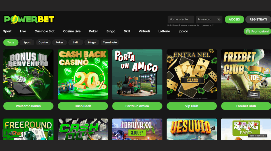 Oltre ai classici, PowerBet include anche un’interessante selezione di giochi alternativi come bingo, video poker, dadi, keno e gratta e vinci. Queste opzioni sono perfette per chi cerca un intrattenimento più rilassato o diverso, ma sempre ricco di possibilità di vincita immediata.