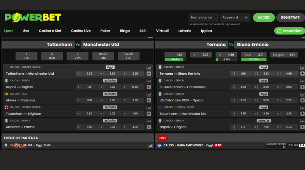 PowerBet si posiziona come uno degli operatori più competitivi del panorama europeo per quanto riguarda le quote sportive, soprattutto nei principali eventi calcistici e tennistici. Le sue quote pre-partita sono regolarmente tra le migliori del mercato, e durante il live mantengono un aggiornamento dinamico e coerente con l’andamento degli eventi. Ciò la rende una scelta ideale sia per chi ama le giocate singole strategiche, sia per gli scommettitori esperti che costruiscono multiple complesse.